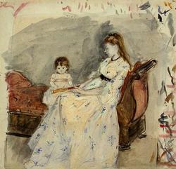 彩画がきれいですよね。このジャンヌがとっても愛らしい顔立ちなんですよ。カウチでお昼ねしていたんでしょか。この数年後に、モリゾもジュリーを生むのですね。